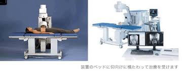 室内は冷房が効いていて結構寒い。Tシャツと短パンで横たわったのでバスタオルを多めにかけてもらう。照射する左腰の部分はちょうどベッドに穴が開いているようになっていてそこに照射部位が来るように位置を合わせた。さらに、反対の右の腰の下に分厚いゴムを入れて体を傾け、照射部位にゼリーを塗り込み、この丸い部分を体に押しつけられる。「ああ、いい感じですー」と若いA医師。「バッチリ」。