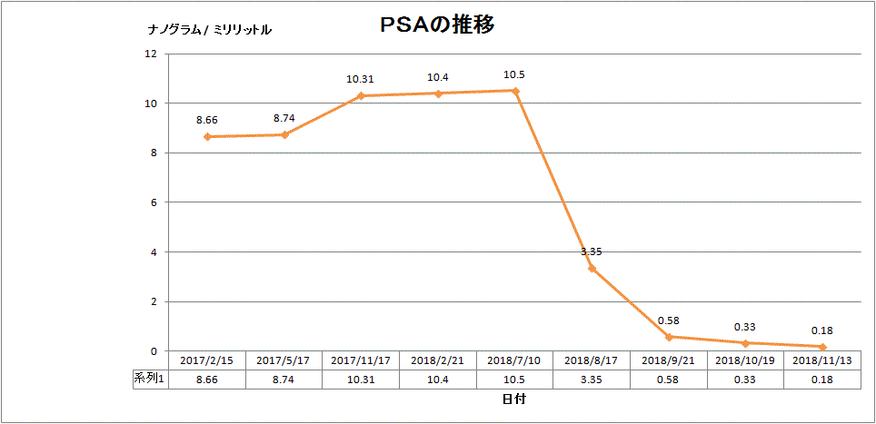 きのう、陽子線照射前に受ける最後のリュープリン注射が終わった。11月13日に採血したPSAの値は0.18ng/mLだった。下に推移(途中から)の表を貼っておく。